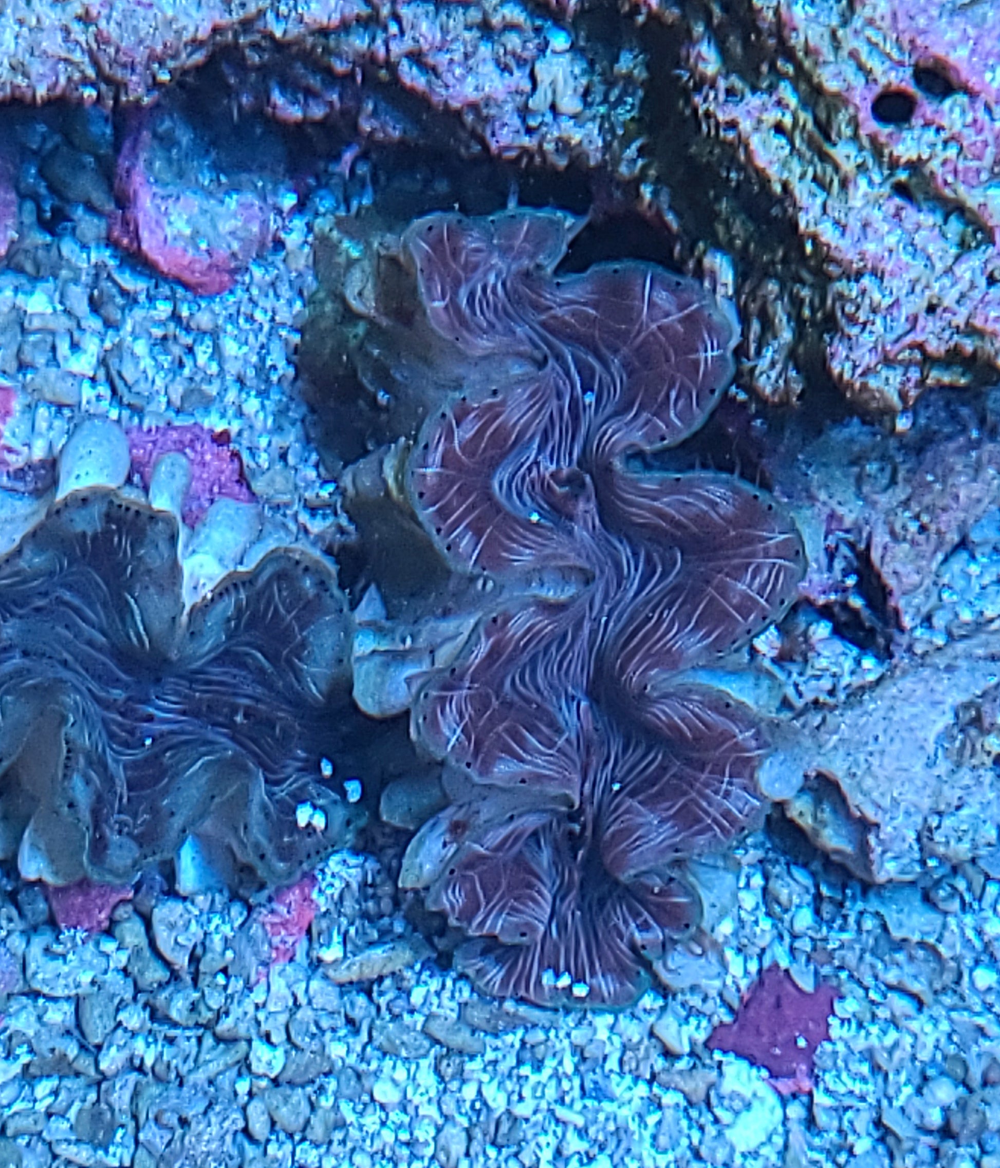 Tridacna squamosa - The squamosa clam is also known as the fluted clam. This species does well in medium to high lighting and has large scutes protruding off of it’s shell. These clams are great beginner clams for aquarists since they grow quickly and are very hardy.