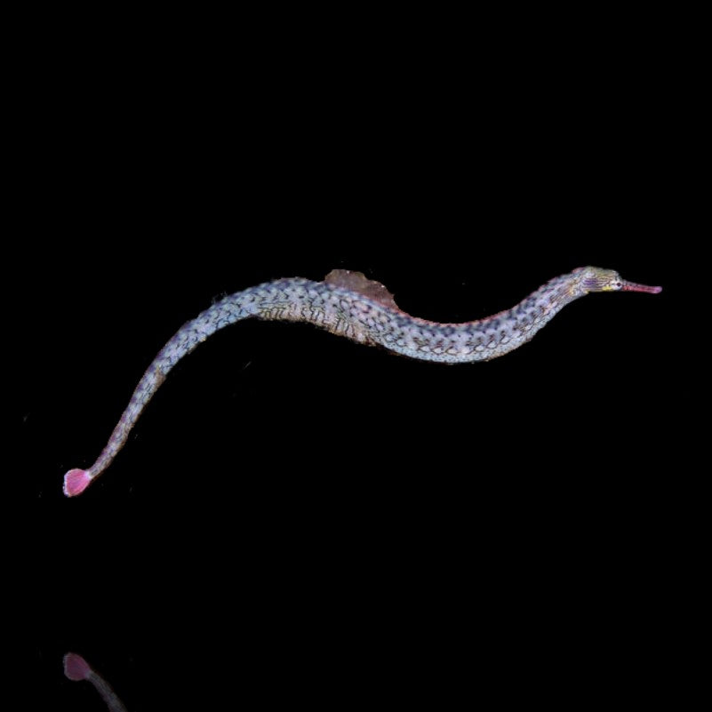 The Dragonface Pipefish is also called the Reeftop Pipefish, Messmate Pipefish, Network Pipefish, and Banded Messmate Pipefish. This fish has a long, slender body with a tiny, tubular mouth and a small pink tail. The body is cream colored with highly variable black, pink, and yellow markings. Each individual has a unique pattern, and some can be very striking and colorful. The South Pacific or Tongan Dragonface Pipefish has been scientifically identified as Corythoichthys haematopterus, and the Western Pacific or Indonesian fish as Corythoichthys intestinalis. Although there are slight differences in markings, these fish look very similar and are oftentimes hard to distinguish from one another. To complicate matters further, some ichthyologists suggest there are over 12 sub-species due to regional variation among these fishes.