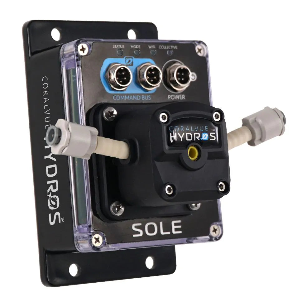 The HYDROS Sole is an aquarium controller hybrid with a heavy-duty liquid dosing pump designed for continuous dosing applications like controlling effluent in a calcium reactor, kalkwasser additions, dosing liquid foods, feeding a sulfur reactor, and performing water changes.